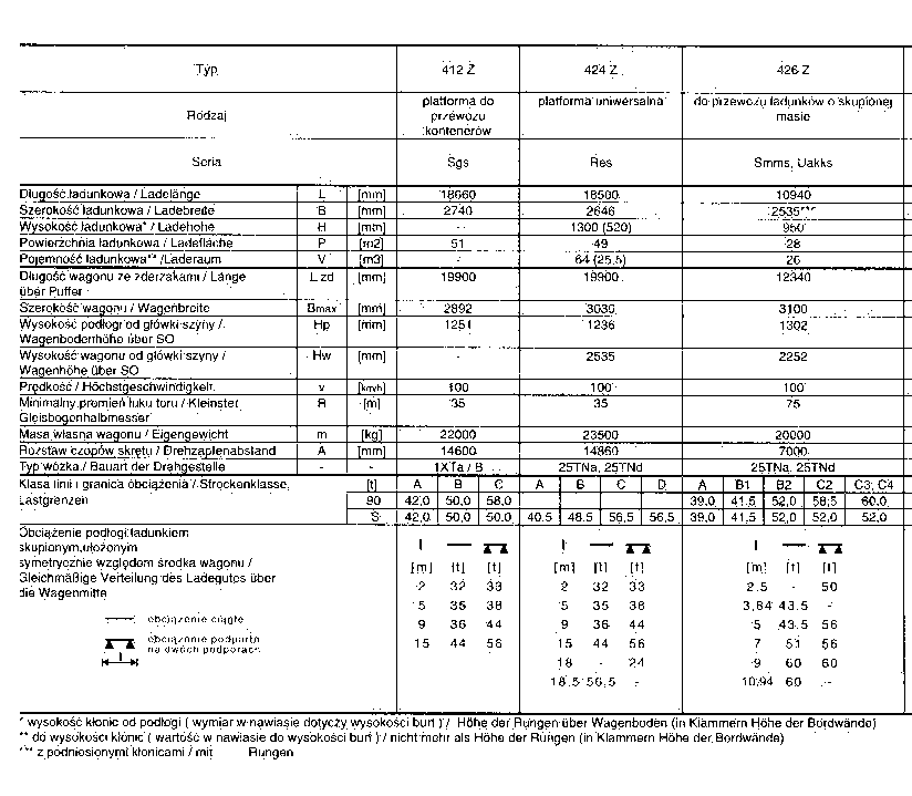 Der in der Tabelle ebenfalls dargestellte Wagen 426 Z (Smms, Uakks) dient dem Transport von Ladungen mit kleiner Auflagefläche (z.B. Kettenfahrzeuge). Die Wagen haben keine Seitenborde. Die Stirnborde (400 mm hoch) sind klappbar und gestatten eine Beladung über die Stirnseite. Die vertikale Stellung der Stirnwand bleibt dank der Rungen erhalten. Am Untergestell sind 12 Rungen (6 je Seite) angebracht, die im Wagenboden eingelassen sind. An den Langträgern sind 14 Niederbindeeinrichtungen vorhanden. Die Be- und Entladung von Kraftfahrzeugen ist über Kopf- und Seitenrampen und durch andere Techniken möglich.