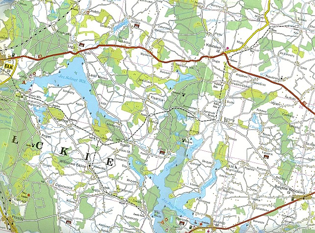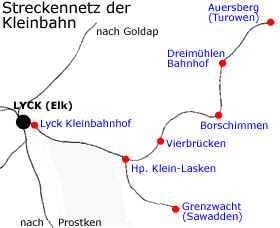 Die Geschichte der Bahnstrecke schildert die Webseite www.masuren-privat.de, der wir folgende Karte und Information entnehmen: