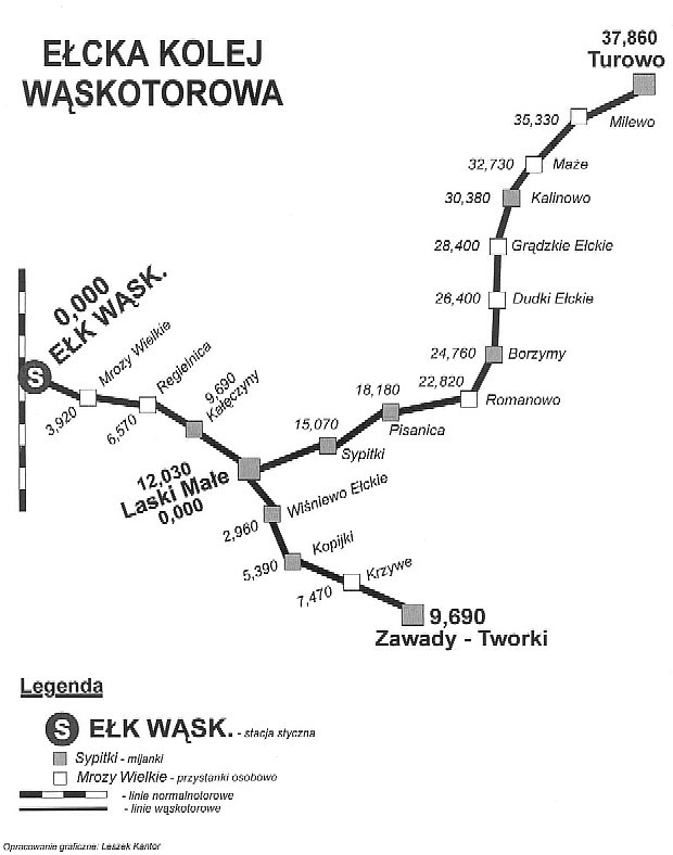 Die Schmalspurbahn von Elk (deutsch Lück) in den Masuren wurde zwischen 1910 und 1917 erbaut. 1992 wurde sie mit der Registernummer A-847 unter Denkmalschutz gestellt. Damit war sichergestellt, dass ein Streckenabbau nicht möglich ist. Wesentlichen Anteil hieran hatten der langjährige Bahnhofsvorsteher Miroslaw Sawczynski sowie sein Bruder, die in dem 1913 erbauten Kleinbahnhof ein Museum errichteten.