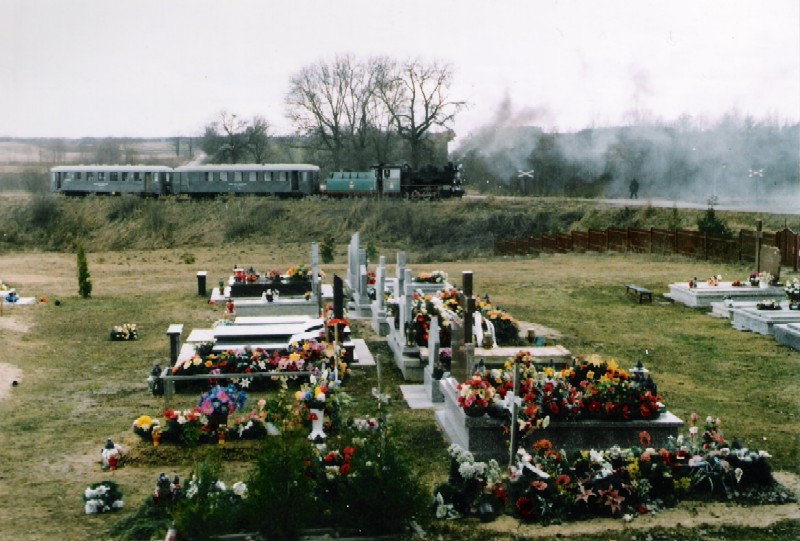 Ein ungewöhnliches Motiv: Ein Dorffriedhof und der Dampfzug.