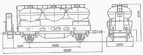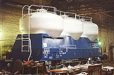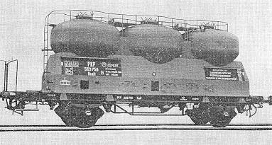 Ces wagons à 2 essieux sont prévus pour le transport de marchandises pulvérulentes, surtout du ciment. Chacun des 3 silos a une contenance de 6,9 m³. Les wagons furent construits sur le chassis des wagons houillers polonais 9W/5 (Frein à main sans abri) ainsi que 9W/6 (Frein à main avec abri sur la plateforme). Les essieux montés sur boîtes à roulements ont des roues de diamètre 1000 mm, la distance entre milieux de fusées est de 2000 mm avec des fusées de 120 x 179 mm. Les ressorts de suspension ont des attaches doubles, il s'agit de 8 lames de ressort de 16 x 120 mm d'une longueur de 1400 mm. La photo ci-dessus montre un wagon après grande révision dans notre atelier partenaire spécialisé, la photo ci-dessous l'état de cette série de wagons construite depuis 1965 au ZNTK de Wroclaw au moment de sa livraison aux PKP.