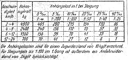 Die nachfolgende Tabelle zeigt die Hakenzugkraft der Lokomotive in der Schmalspurversion in Abhängigkeit von der Streckensteigung bei unterschiedlichen Geschwindigkeiten.